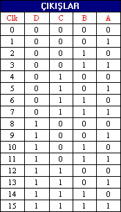 Şimdi 4 bit (4 çıkışlı) senkron sayıcıyı ele alalım. 4 bit sayıcı için dört adet flip flop kullanacağız. Aşağıda 4 bit senkron sayıcının çizimi ve çıkış tablosu görülmektedir.![]()
